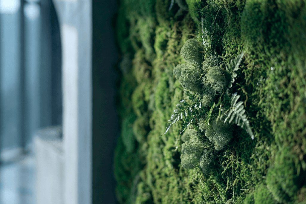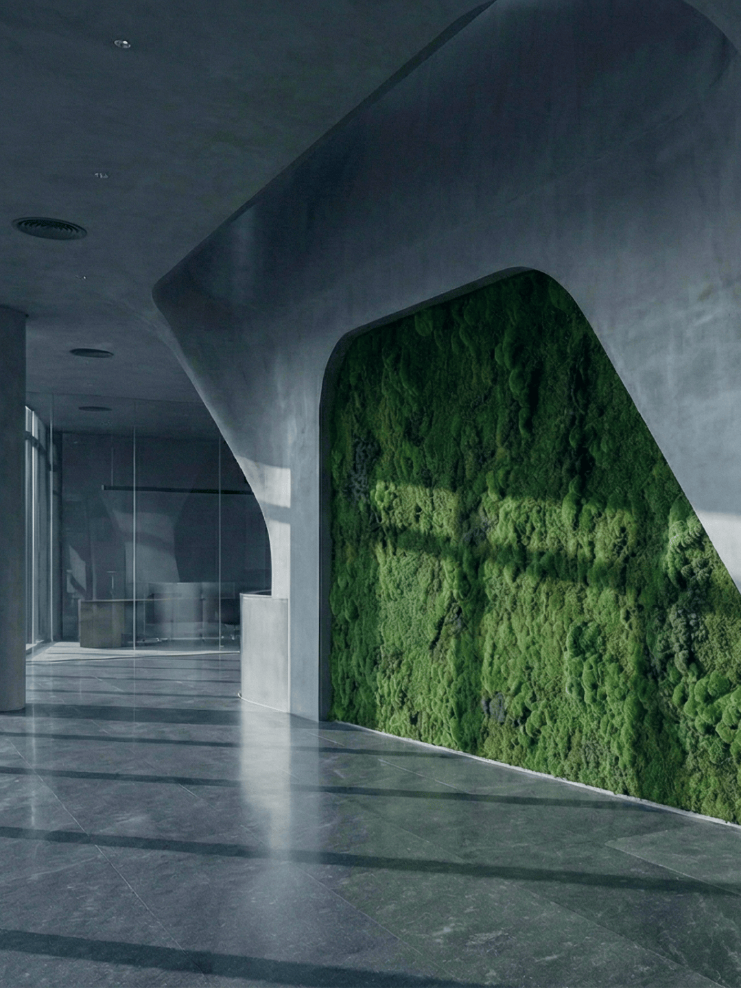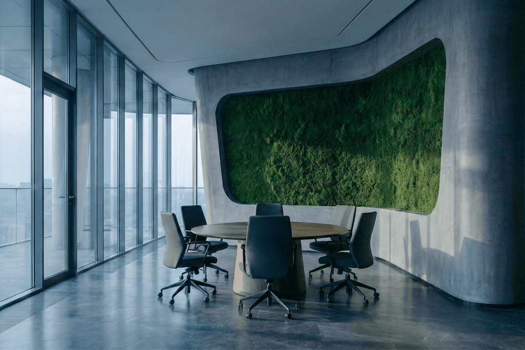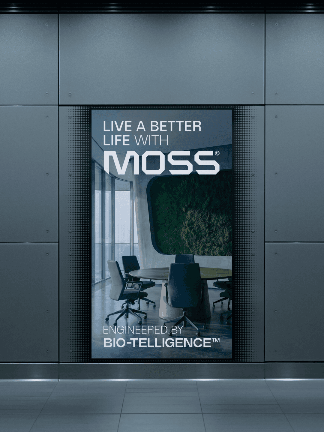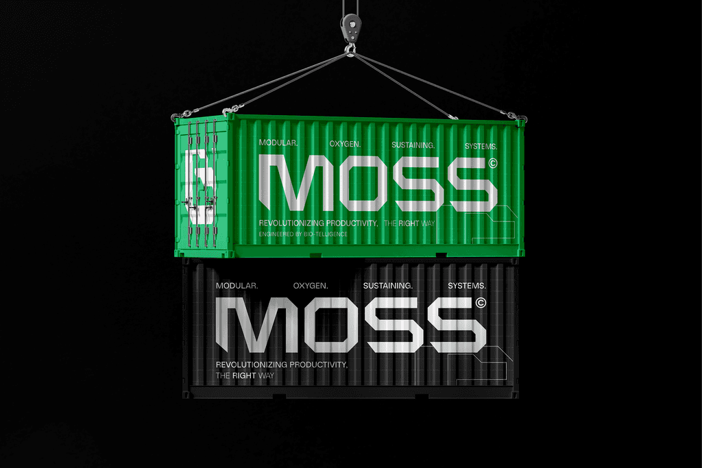 At the center sits MOSS (Modular Oxygen Sustaining System), a smart green wall that improves air quality while providing real-time environmental feedback. The visual identity, developed through brand design, art direction, and motion design, balances organic inspiration with geometric precision, expressing the intersection of sustainability and technology.