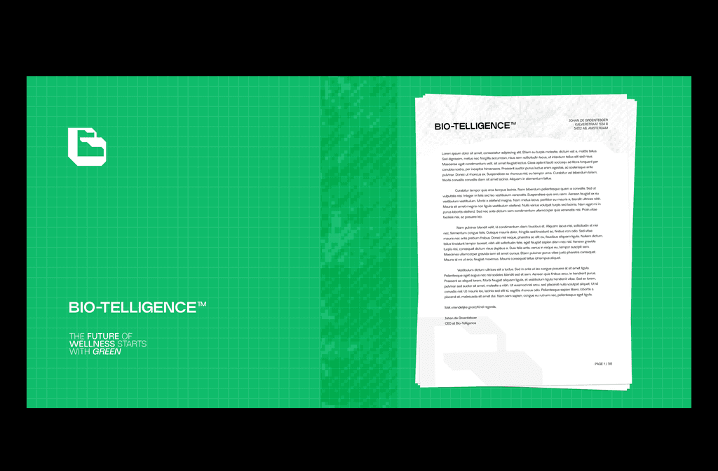 For BIO-TELLIGENCE, the visual identity needed to communicate a balance between nature, technology and future-thinking innovation. The brand language blends organic inspiration with geometric precision. The logo is constructed from structured forms that symbolize technological systems while subtly referencing natural growth and harmony.